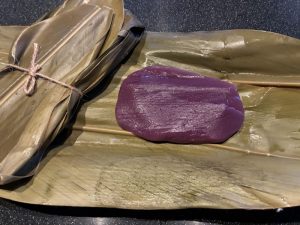 「ムーチー」は沖縄方言で「餅」の意味で、もち粉を黒糖や紅芋などで味付けし、サンニン(月桃)の葉で包んで蒸したものです。 月桃の葉には厄除けの意味があり、その香りと共に「鬼を払う餅=鬼餅」として古くから親しまれてきました。
