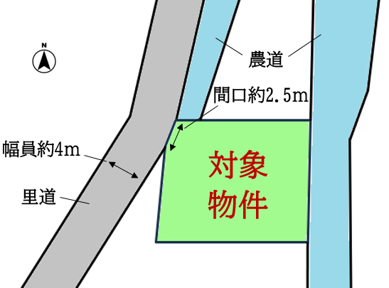 | 接道状況 | 一方道路 | 接道 | 北西/公道/舗装無/間口2.5m/幅員4m/ |