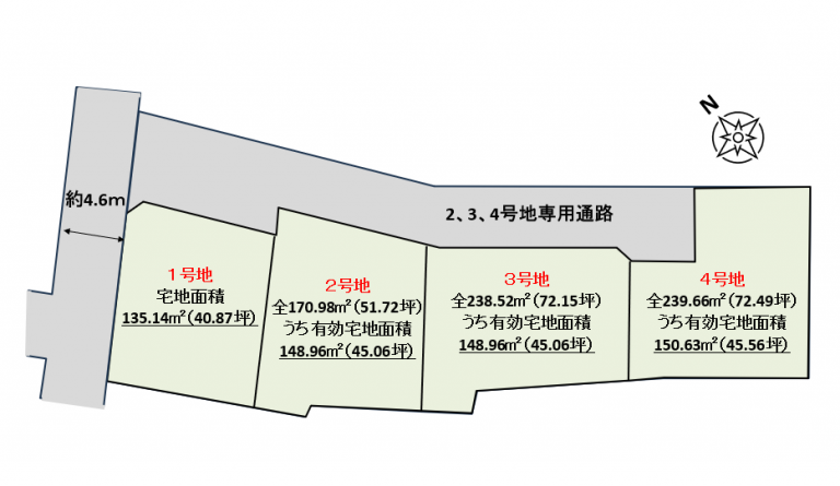 | 備考 | ・1号地:3098万円 2号地:3098万円 3号地:2898万円 4号地:2698万円 ・分筆および隣地境界ブロック塀設置後引渡し。 ・専用通路部分舗装後引渡し。 ・重要土地等調査法 特別注視区域内。 ・売買面積に専用通路部分含む。2号地:22.02㎡(約6.66坪)3号地:89.56㎡(約27.09坪)4号地:89.03㎡(約26.93坪) |