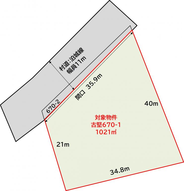 | 接道状況 | 一方道路 | 接道 | 北/公道/舗装有/間口35.8m/幅員11m/ |